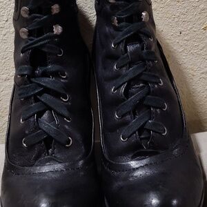 Frye black leather lace up ankle booties are a size 6.5 in very good pre-owned condition. Overall height:9", length: 10.5", widest part of outsole: 3", heel height: 4". Upper and outer material: leather. No holes, or tears. No discoloration of the leather. Please view all photos as they are part of this item's description. Any questions please contact me, thank you for stopping by.