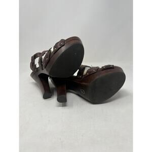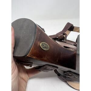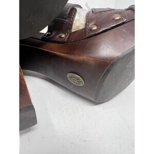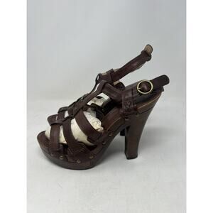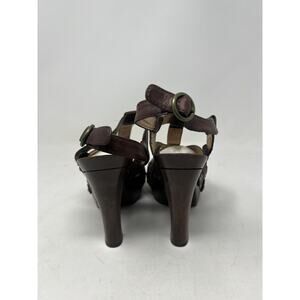 FRYE Brown Leather Dara T Strap Sandals Wooden Heels Sz 8.5 M Ankle Strap Boho. Condition is Pre-owned. Shipped with USPS Ground Advantage.
