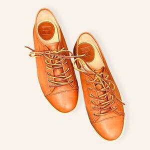 FRYE brown leather low-top sneakers. Crafted from supple genuine leather in a rich rust-brown hue, these sneakers feature rawhide leather laces and a durable rubber sole. The minimalist silhouette pairs effortlessly with jeans, dresses, or casual trousers, making them a versatile staple for year-round wear. Lightly worn with minimal signs of use—excellent overall condition.