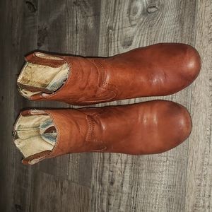 FRYE Carson Wedge Bootie Cognac, pre-owned condition, some discoloration on leather, antique soft vintage leather upper, leather lined, zipper closure, the zipper some times got stuck on one of them when you try to close it, size 6.5M.