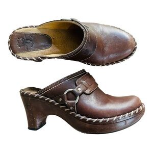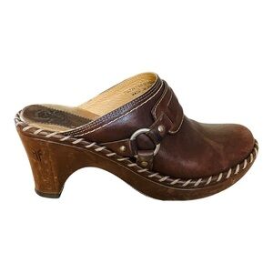 Gorgeous FRYE Charlotte leather mule clogs in rich chocolate brown. Handcrafted from genuine leather with whipstitch trim, wooden platform heel, and antique brass rivet details. These heeled clogs are the perfect mix of Western charm and timeless Frye quality.