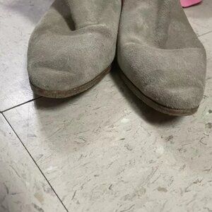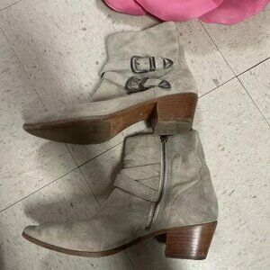 Suede upper with rubber sole. Side zip closure. Strap details with etched buckle accents. Intentionally distressed areas throughout. Heel measures approx 2" H.