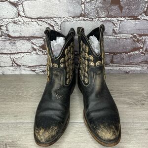 FRYE Jenna Disc Short Black Distressed Leather Rivet Stud Boots Women 6B US/36.5