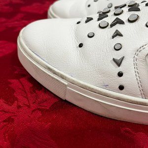 Women's White Slip-On Shoes. Feature a studded design on top. Used in good condition. The bottom sole is a bit dirty but can be cleaned. There is what seems to be a blue pen mark on the white leather (shown in pictures). It is close to the seam, so it doesn't stand out.