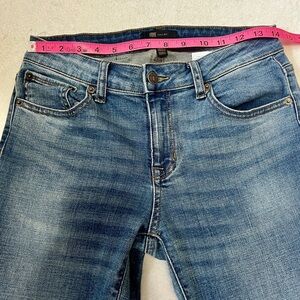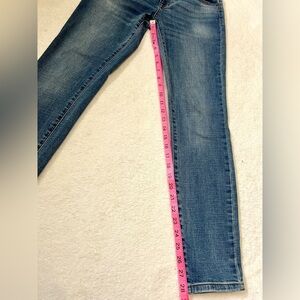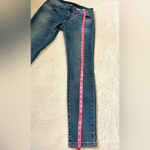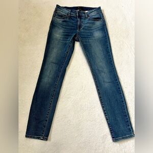 FRYE branded classic skinny denim jeans in a lighter wash color, higher rise, front and back pockets, zipper and button closure.