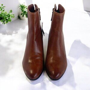 Step confidently into style with these gorgeous Western style Megan FRYE ankle booties. Crafted from rich brown cognac leather, they feature a comfortable stacked 2.5" heel, almond shaped toe and easy side zip for effortless wear. Rubberized sole for traction. Dress up or down, these boots make any outfit look put together. Brand new. NWT.
