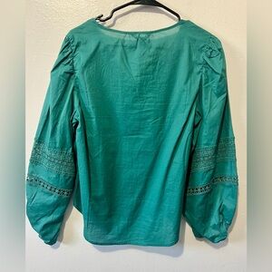 Beautiful FRYE branded bohemian peasant style blouse in an emerald green color, crotchet details on the sleeves, decorative ties on v-neckline, elastic cuffs, lightweight 100% cotton fabrication, slightly oversized/looser fit, settle puffed shoulder.