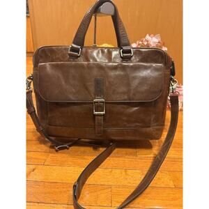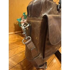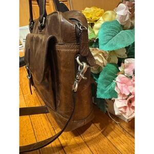 Men's BROWN leather Frye Oliver briefcase with silver-tone hardware, adjustable flat shoulder strap, four exterior pockets, brown canvas lining, dual interior pockets, single interior laptop compartment, dual interior pen holders and buckle-accented magnetic snap closures at front flap. Shop authentic designer handbags by Frye