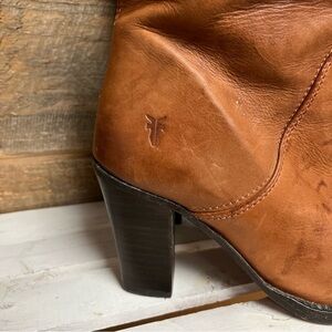 FRYE Womens Heel Boots Size 8.5 Cognac Leather Mid Calf Side Zip 77730 Vintage