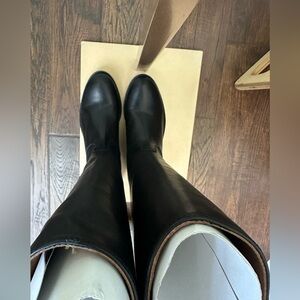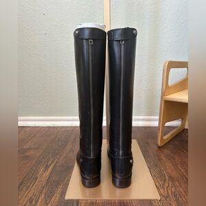 - Pull-on equestrian boot featuring an asymmetric topline and back zip, contoured through the ankle for support.