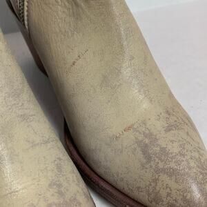 Boots are in great preowned condition. These have barely been worn. They have the distressed leather look. There are two scuffs on the top of the left bootie that blend in with the aesthetic, but I don't believe were part of the original manufacturing.