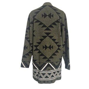 FRYE Women's Southwestern jacquard Open Cardigan Size Small S, Aztec Print, Color is Green/Black. Has pockets, long, Duster, Patterned. Great Pre-Own Condition.