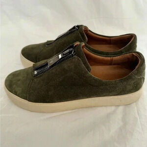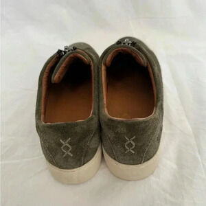 Beautiful olive color Frye suede slip on sneakers with zipper in front .