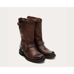 Frye has a long history of leather specialty, so it's only natural their pieces are based around it. The Veronica biker boots are made from vintage leather that's been washed and oiled, as well as hand antiqued and polished, giving the pair a two-tone, worn finish. The classic moto buckle detailing and mid-calf height completes the look.