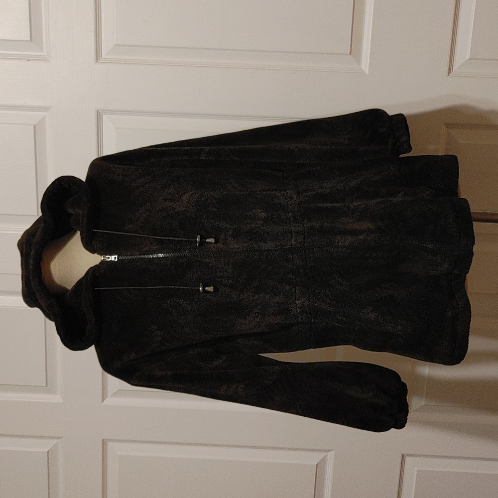 Zip up front with hood and drawstrings.