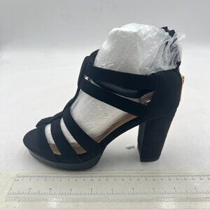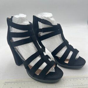 FSJ Black Chunky High Heel Sandals Open Toe T-Strap Cutout Dress Party Prom Office Strappy Shoes Elastic Back Zipper
