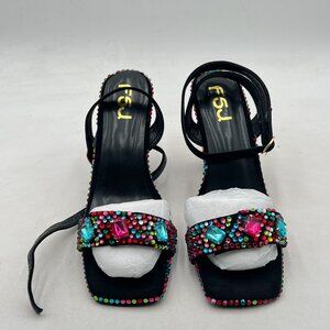 FSJ Black Colorful Rhinestones Diamond Heel Square Open Toe Ankle Strap Sandals