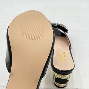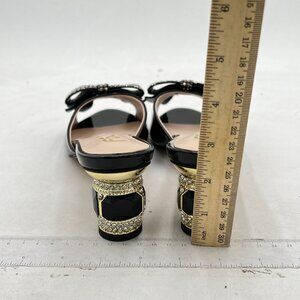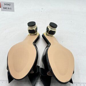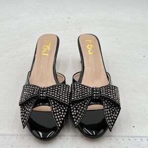 FSJ Black Low Heel Rhinestone Bow Mule Sandals Peep Toe Crystal Slipper