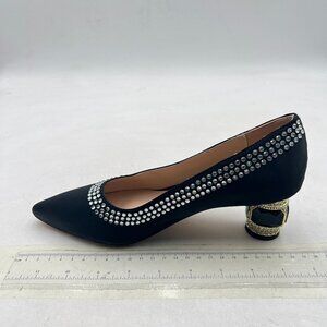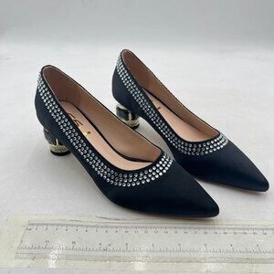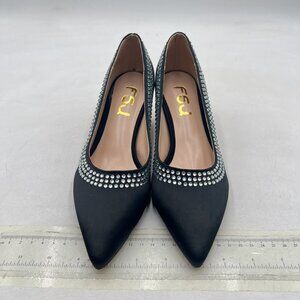 FSJ Black Satin Bridal Pointed Toe Block Low Heel Crystal Pumps Slip on Shoes