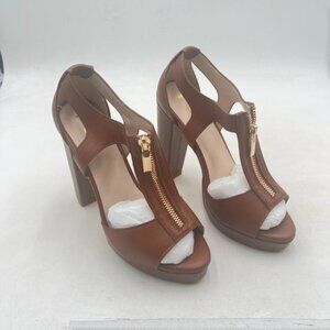 FSJ Brown Peep Open Toe T-Strap Front Zipper Chunky Stacked High Heel Sandal