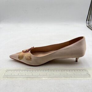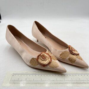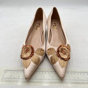 FSJ Champagne Kitten Low Heel Embroidery Pumps Pointed Toe Flower Satin Shoes
