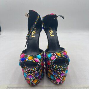 FSJ Gems Platform Chunky Heel Open Toe Crystal Ankle Strap Sandals Party Shoes