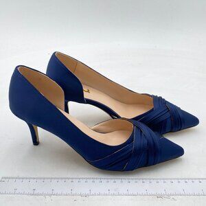 FSJ Navy Kitten Heels Pointed Toe Slip on Pumps D'Orsay Pleated Satin Dress Shoe