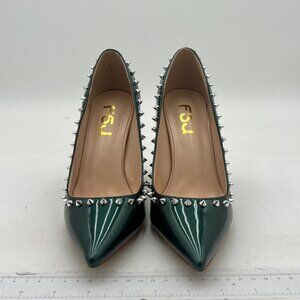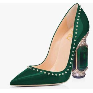 FSJ Olive Rivets Pointed Toe Chunky High Heel Crystal Pumps Slip on Wedding Shoe