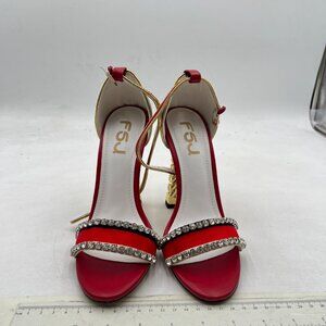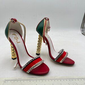FSJ Red Green Gold Metal Chain Chunky High Heels Ankle Strap Open Toe Sandals