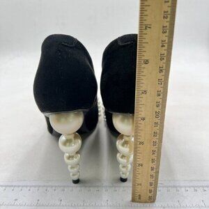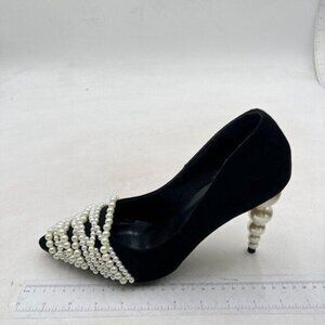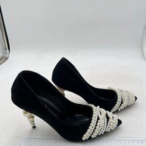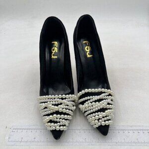 FSJ Slip On Pearls Beaded High Heels Slip On Pumps Pointed Toe Mirror Black Shoe