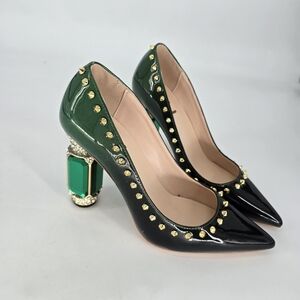 Women Bridal Pointed Toe Chunky Block High Heel Crystal Pumps Slip on Wedding Thick Comfort Evening Dress Studded Rivets green Shoes heels stelledo chunky
