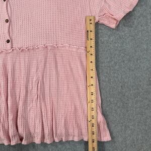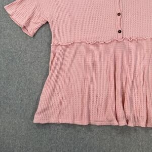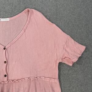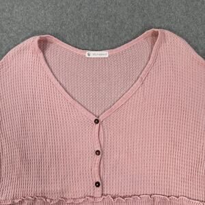FSL Apparel Waffle Knit Ruffle Hem Top Women's Medium Pink V-Neck Short Sleeve