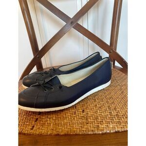 Lovely made in Italy leather flats with white sole and navy leather upper toe closure detail at toe. Gently worn maybe once