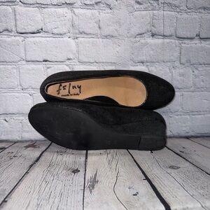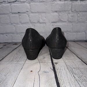 French Sole New York size 8.5 Zappa wedges in black/metallic snack embossed upper. Genuine leather. Slip-on. Round toe. Cushioned foot bed. 1.5” wedge heel. Grip rubber soles.