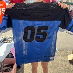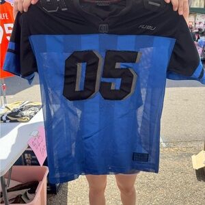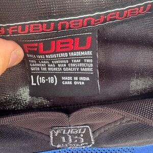 FUBU jersey with '05' emblem. Black and blue design. Ideal for sporty looks.