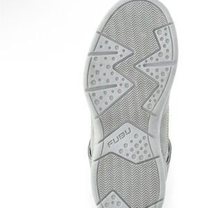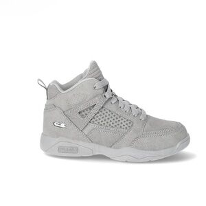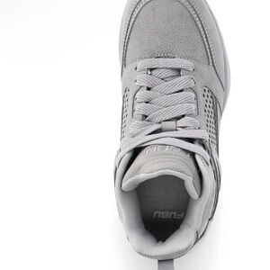 Gray suede sneakers with perforated design. Secure lace-up style.