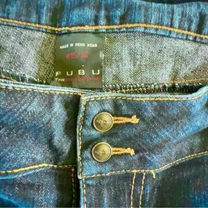 FUBU designer vintage low rise jeans, back pocket embroidered, straight leg, dark blue denim Y2K aesthetic jeans