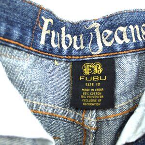 The product is a pair of Vintage FUBU Y2K skull skeleton faded baggy skater hip hop boy's jeans in size 12. These jeans feature a solid pattern with skull characters, blue color, 82% COTTON 18% POLYESTER denim fabric. The brand, FUBU, is known for its hip hop theme, and the jeans are designed for streetwear, skateboarding, and hip hop activities.