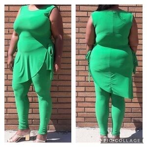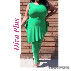 Fuchsia! Diva Plus 2 piece pants & top. Pants are leggings like w-elastic waist. Top has round neck & cute ties on each side. Slightly asymmetrical. Comes past hips. Very soft. 95% Poly 5% Spandex. Last pic is actual color