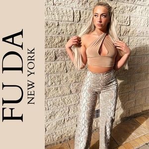 NWOT FUDA New York Faux Snakeskin Pants. Size 10. Tan And Cream Snakeskin Print. Straight Leg. 100% Polyurethane.