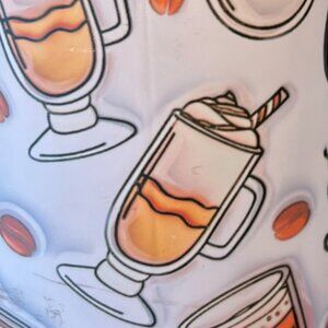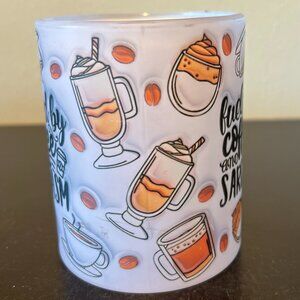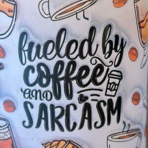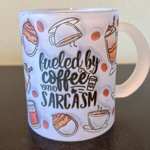 Thick-walled white frosted glass mug with an artistic wraparound montage of images of floating whole coffee beans and freshly brewed caffeinated coffees, cappuccinos, lattes, iced coffees with whipped cream in mugs, cups and saucers, pedestal cups. Stylized dark brown text on both sides reads, Fueled by coffee and SARCASM. The exterior design decorates the interior in reverse. Thick comfortable frosted glass handle. Measures 4.25 ”tall with a 3.25 ”diameter; 5” across including the handle. Holds 16 fluid oz.