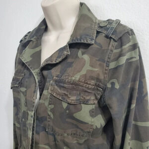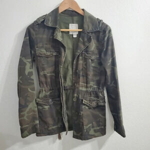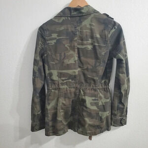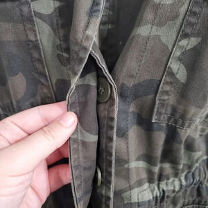 Army green camo button down jacket with pockets and adjustable drawstrings at the waist. Size XS. EUC.