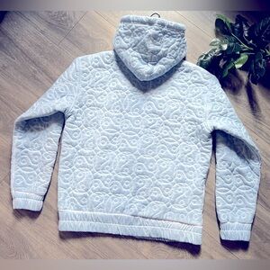 Quilted Yin Yang design. Fleece lining. Drawstring hood. Front pocket pouch. Cuffed long sleeves and hem. Elastic hem and cuffs. 60% Cotton 40% Polyester. Machine wash. Imported.