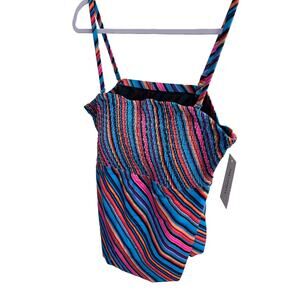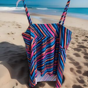 Get ready for a day at the beach with this stunning FULLFITALL Swimsuit Top! This bathing suit top is in size 18 and features a striped pattern in a tropical beach theme. The tank-style top has thin/removable straps and is made of a combination of nylon and spandex materials for comfort and durability.