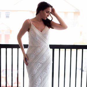 Made in a slimming diagonal pattern of crochet lace and embroidery, this stellar gown features a fitted bodice with spaghetti straps , V neckline and V back. The slim fitting, long skirt has a grazing train.