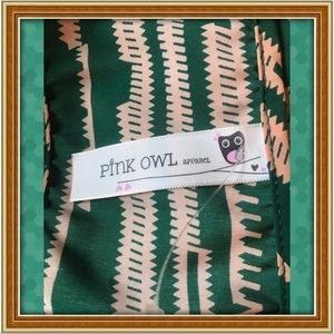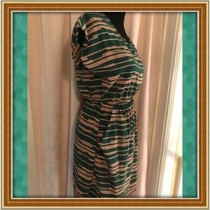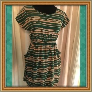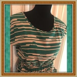 Cute lil dress that is so easy to throw on!! Comfy elastic waist. Full bodice. Emerald and tan colored. Shoulder to hem is 33 inches and under arm to under arm is 18 inches across.