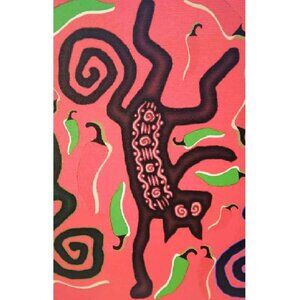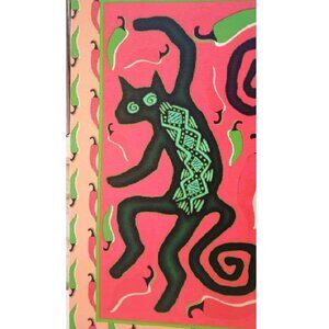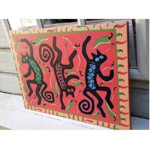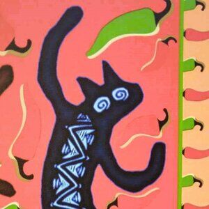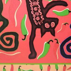 This is an absolutely FUN and Joyful Dancing Peppers Cats Giclee Canvas Wrap Unlimited Original Art Print. The print is from an original graphic design by Award Winning California Artist John A. Conroy and is printed on canvas and wrapped around the edges. The print features stylized cats dancing and jumping for joy surrounded by hot peppers.