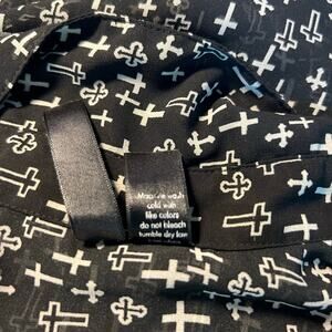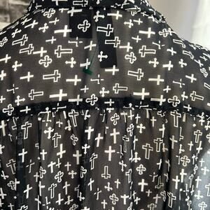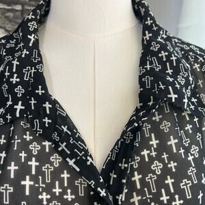 FUN & FLIRT Semi-Sheer Blouse Black W/ White Crosses Religious Punk Grunge Goth