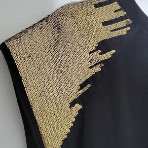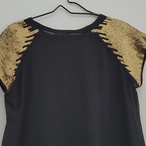 cute top, sheer, sequined on shoulders, adjusted on bottom, sined size- m, but pretty big.