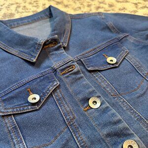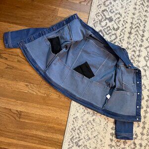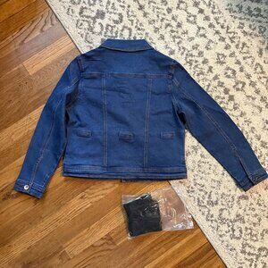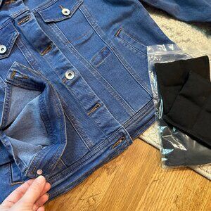 Brand new, never worn! This just didn't work for my kiddo, but it might be perfect for yours (or you! It would easily fit a Womens XS.) The denim is soft and stretchy, but firm enough to hold it's shape and support the weight of the beanbags. There are pockets inside with Velcro closures you can add the bags to - however many feels right! The inside of the front hand pockets are a super velvety fleece that feels sooooo good on the fingers. This jacket does not have tags inside (the one little white tag is made to rip off) and no thick, uncomfortable seams. Measurements provided in the photos, but it was true to size on my son - he typically wears a 10 and this Medium worked perfectly with a long sleeve tee underneath. With the stretch I know it could go up to a 12.